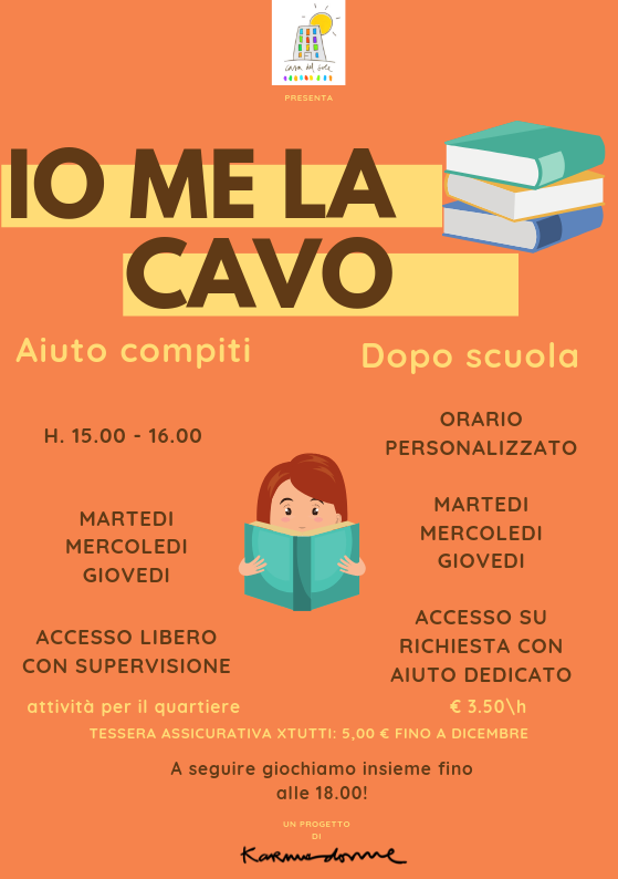 Vi aspettiamo tutti giovedì 29 settembre dalle ore 16,00 in via Ivrea 10, vi aspetta un buffet, i soci di Karmadonne che vi apriranno le porte di “Casa del Sole” e vi daranno le prime informazioni per il l’aiuto compiti “Io me la cavo”.